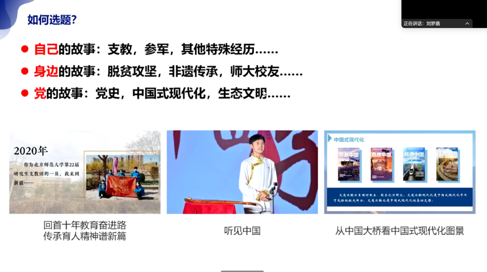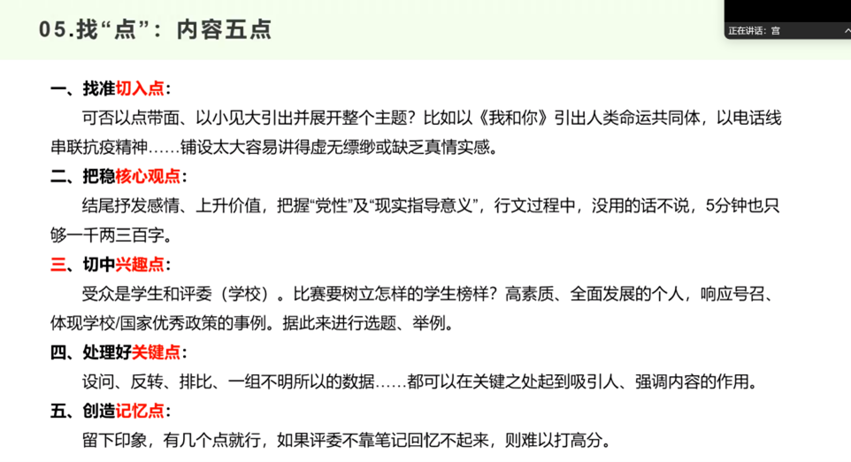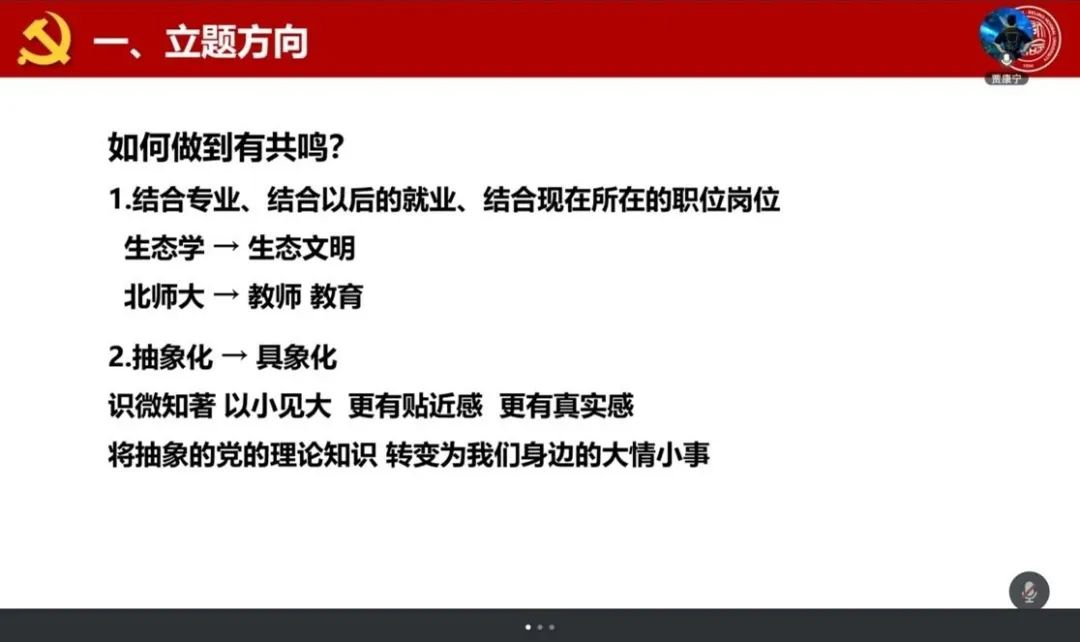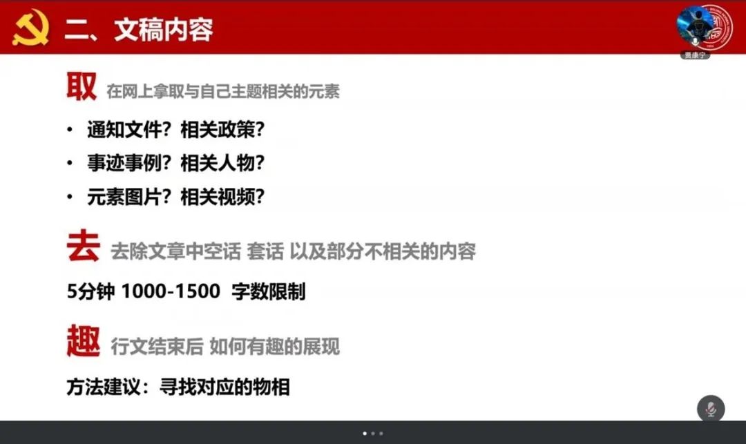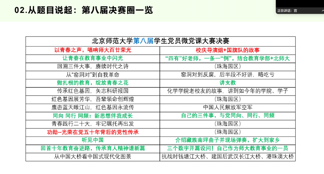 宫一男同学结合五届微党课指导经验,系统梳理了备赛经验,他提醒到,微党课大赛有时长限制,需要避免信息过载,抓住小要点讲透即可,同时切勿忽略党课的党性教育属性。自拟题目极为关键,要有区分度,体现对活动的重视,方便写稿与得分,好题目能助评委快速建立预期。他还结合今年众多参赛讲稿,逐一点评,像提醒 “以中国式现代化,全面推进中华民族伟大复兴” 此类课程式微党课需另拟生动题目,挖掘 “以教育为笔绘强国蓝图” 亮点,还分享春节、皮影戏、卢沟桥等素材。在选题上,要主题聚焦、切入精巧、架构轻盈,贴近生活结合专业,行文逻辑严密、内容科学,巧用个人或身边人经历并深入思考。