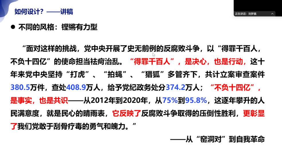 首先,刘梦嘉同学系统梳理了微党课创作要点:微党课需紧扣主题,通过小故事折射大理论,时间控制在5分钟内(讲稿2000字内,PPT约10页),避免内容冗余。选题方面她推荐三类路径:亲身经历、身边故事及党史专题,其中真实经历最具感染力。内容架构需兼顾"叙事"与"明理",既要故事脉络清晰,又要在讲述中自然融入理论升华,避免结尾生硬拔高。她还以自身反腐主题获奖作品为例,示范如何通过排比递进、详实数据增强感染力,建议根据选题风格选择铿锵有力或娓娓道来的表达方式。PPT设计方面,她提醒大家要注重风格统一与配色和谐,善用特殊字体,同时避免大段文字堆砌以保持观众注意力。最后,在现场比赛时,最好脱稿呈现、注意着装得体,可以通过语气变化与肢体语言提升感染力。