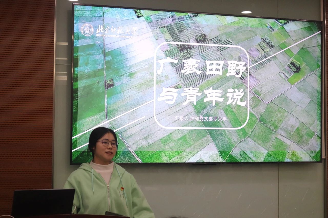 致知党支部罗兴宇同学以“广袤田野与青年说“为主题,通过“全国乡村振兴青年先锋”王天宇的故事,谈到了当代青年在乡村振兴中、在“广袤田野”中,也应担起青年的使命。