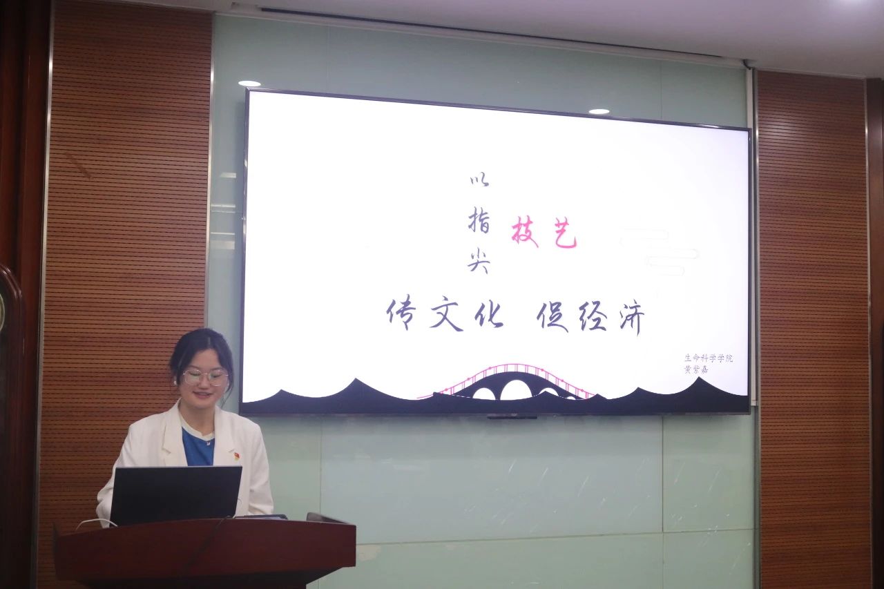 致远党支部黄紫嘉同学以“以指尖技艺,传文化,促经济”为主题,通过石丽平的具体事例:发扬了苗绣的指尖技艺,带动了当地的指尖经济,强调了要将优秀传统文化转为当代中国的新文化变为推动经济发展的不竭动力的观点。