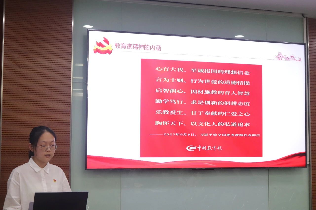 励学党支部李晨曦同学以“弘扬教育家精神 做堪当大任的时代新人”为主题,从教育家精神的提出、教育家精神的内涵、新时代的新标准、大力弘扬教育家精神、师大人的时代使命五个方面进行了讲解,呼吁青年们做堪当中华民族伟大复兴大任的时代新人,到祖国需要的地方去。