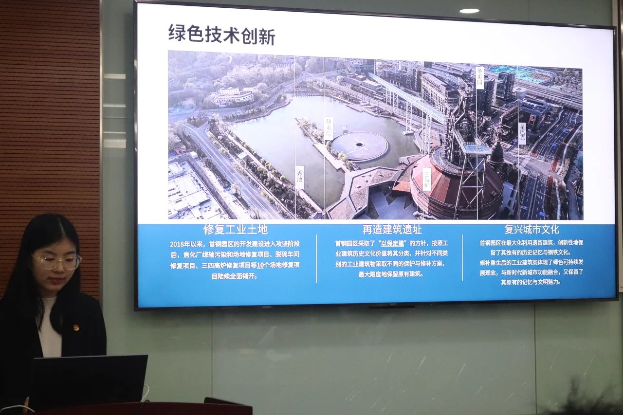 崇德党支部张雪同学以“钢铁园区变奏曲“为主题,谈创新赋能发展,回顾百年首钢的历史,讲述首钢的绿色技术创新和商业模式创新带来的变化,最后结合习近平在二十大报告中关于科技和创新的指导,深化创新赋能发展的主旨。