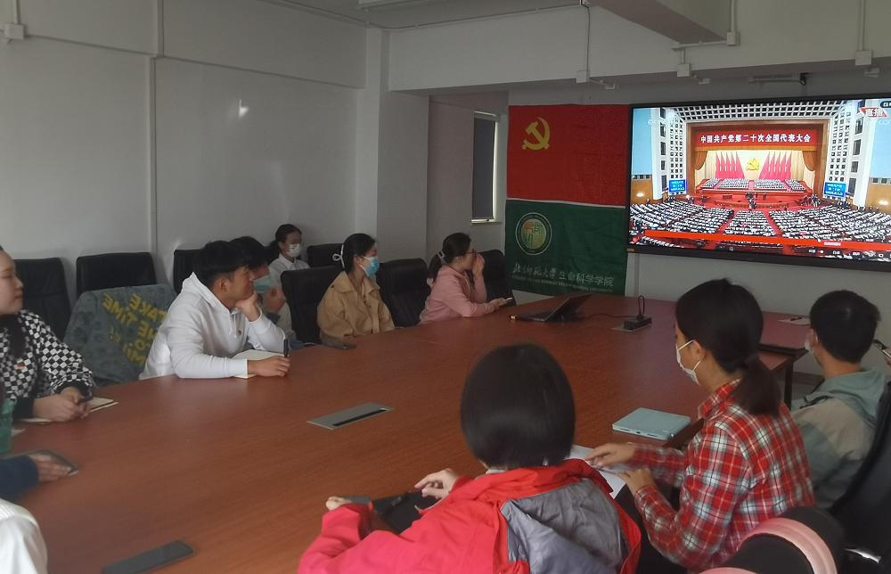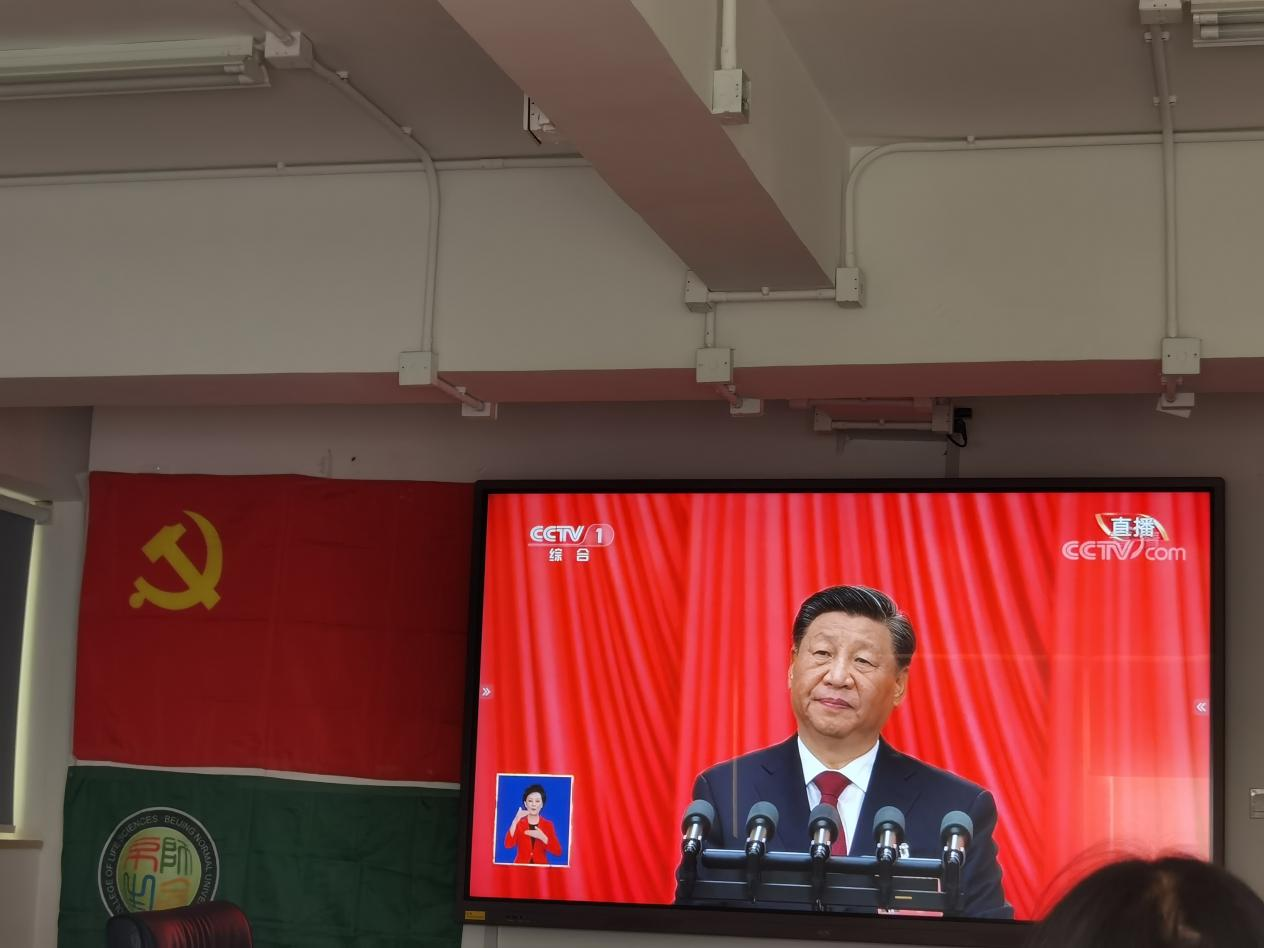 2022年10月16日10:00,中国共产党第二十次全国代表大会开幕会在北京人民大会堂隆重举行。中共中央总书记、国家主席、中央军委主席习近平同志出席大会并发表重要讲话。万象城awc官网登录入口组织各学生党支部支委在生态楼419会议室观看直播,党委书记王天明老师、党委副书记殷实老师、团委书记尹佩佩老师莅临现场,共19人参与。