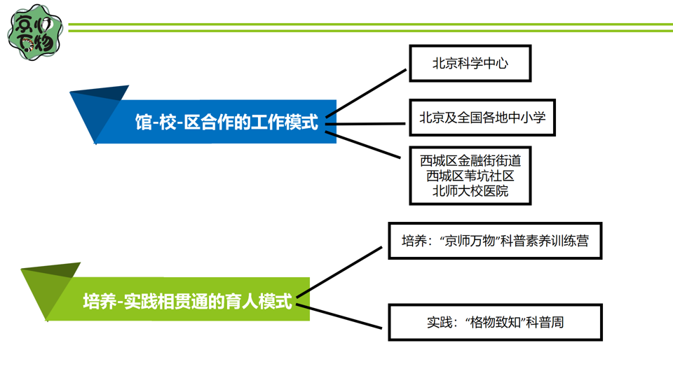 馆-校-区合作的工作模式与培养-实践相贯通的育人模式让“京师万物”科普品牌逐渐发展壮大,同时保证源源不断的新鲜血液汇入宣讲团大家庭,形成良性循环。