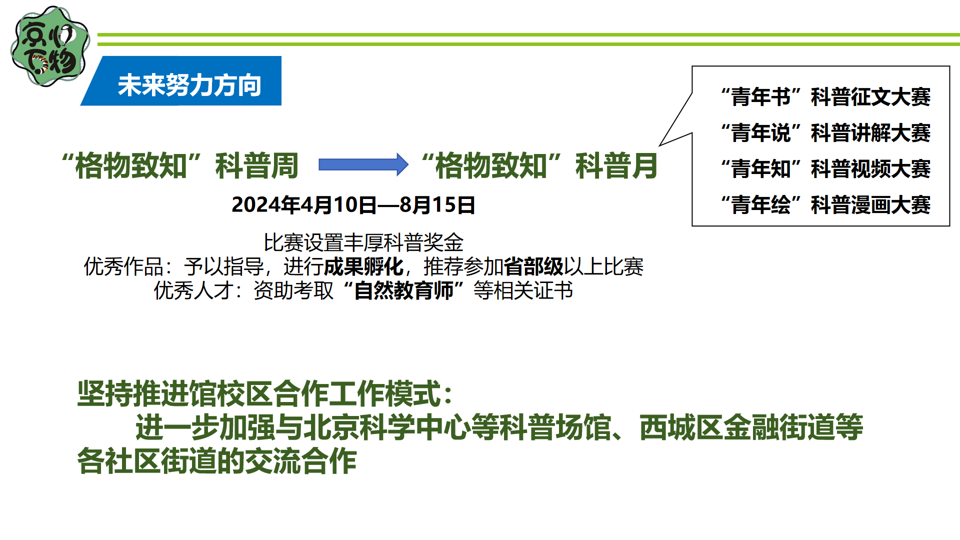 未来,学院预计将“格物致知”科普周拓展为“格物致知”科普月,并设置丰厚的科普奖金,支持优秀作品进行成果孵化,并鼓励优秀人才考取“自然教育师”等相关证书。同时坚持推进馆-校-区合作工作模式,在交流合作中将“京师万物”的品牌越办越好。