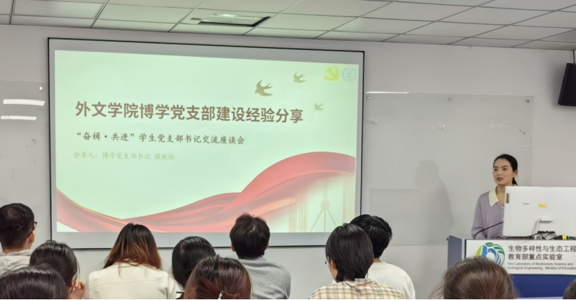 随后,由外文学院的薛欣怡同志向我们分享外文学院博学党支部建设经验,并重点介绍了与万象城官网崇德党支部的联学共建项目。两个党支部共开展20次不同主题和形式的共建活动,增强了党员的参与感和支部的凝聚力。同时,博学党支部充分发挥学科特色和优势,开展了“博学读书会”“博学多语汇”等品牌活动,并多次在大型国际会议中提供语言服务,在提升党员的党性修养的同时锻炼了专业能力,在国际舞台上展现中国青年的风采。