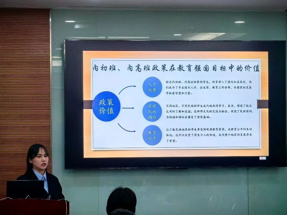 图玛日斯同学在题为《以教育为笔,绘强国蓝图——内初班、内高班篇》的微党课中深情讲述个人经历。她提到,自己的家乡新疆喀什因教育资源匮乏、经济滞后,导致自己成长受限。但幸运的是,她在“内初班”“内高班”政策的帮助下得到了更多学习的机会,从而得以享受优质教育资源,开阔视野。她指出,这不仅是个人故事,更是众多新疆学子缩影。她感恩政策,决心努力学习,将来奔赴祖国需要处,助力更多孩子获得优质教育。
