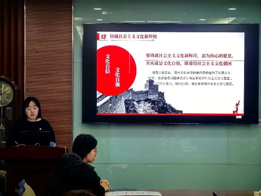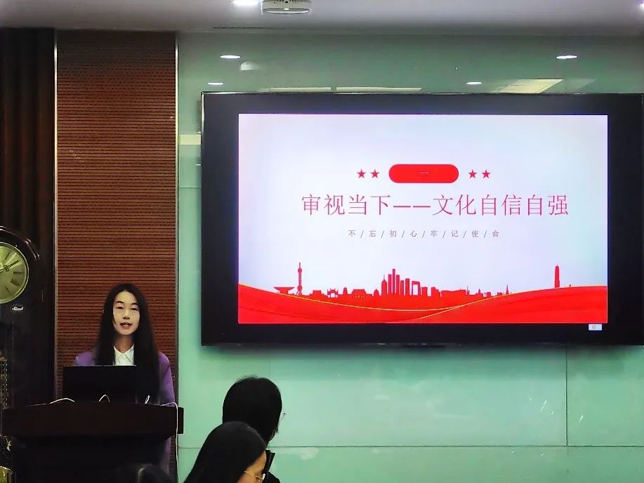李雅萱同学在此次微党课中以《豫见文化自信,续写文化传承》为题,以豫文化为例,分析新时代背景下文化自信与社会发展的结合。豫文化历史悠久、内涵丰富,如《唐宫夜宴》借三彩俑等元素,结合著名画作与文物,生动还原唐朝风貌。她提到,新时代青年要以创新的表达方式传承文化,利用新媒体、现代设计等将文化展示给大众、融入生活,推动文化产业发展,实现文化自信与社会发展良性互动。