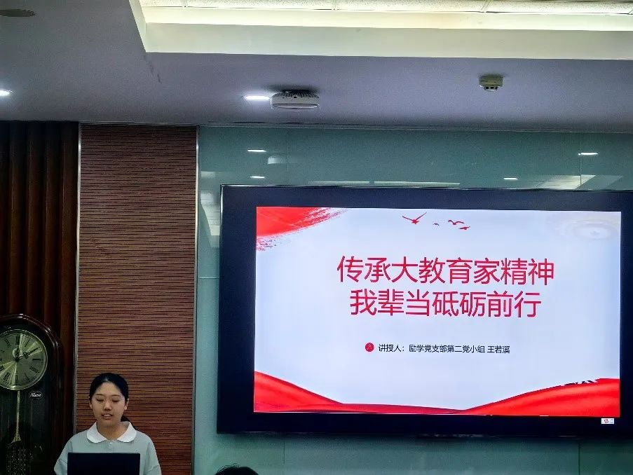 郑希羽同学为我们带来题为《传承教育家精神,做新时代“大先生”》的微党课,她阐述了源于中华优秀传统文化、具有爱国、立德、以人为本、仁爱等特质的教育家精神,并结合孔子等古代教育家及顾明远等近现代教育家事迹,深入理解其内涵。她提到,新时代的青年应深入学习教育家精神,汲取榜样力量,借助北师大等平台提供的实践机会,积极参与支教等活动,发挥示范作用,助力教育强国建设。