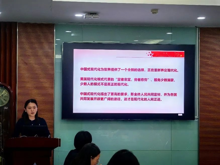 钟梓铱同学在此次微党课中以《以中国式现代化全面推进中华民族伟大复兴》为题,结合中国式现代化的五个特点,分析在经济、文化、政治等领域推进中华民族伟大复兴的路径。她紧扣习近平总书记讲话,指出中国式现代化的特色与优势,在经济、文化、政治方面提出发展策略,强调其在推动共同富裕和和谐社会建设中的作用。