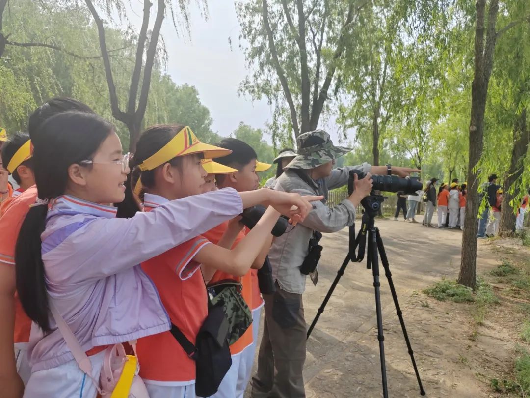 2024年5月9日下午,在密云一小、密云区园林绿化局和北庄镇的支持与帮助下,宣讲团志愿者带领150名密云一小的四年级学生一起去北京市密云区搜狐农场进行了观鸟实践教学课程。沿清水河溯流而上,一直到“爱鸟之家”北侧树林,志愿者们带领同学们走进自然、亲近自然,亲自体验观鸟的过程,感受密云丰富的生态资源。一路上,同学们通过单筒望远镜和摄像机对鸟类进行拍摄,观察不同鸟类的形态行为特征并各自交流分享心得,乐趣多多、收获多多。