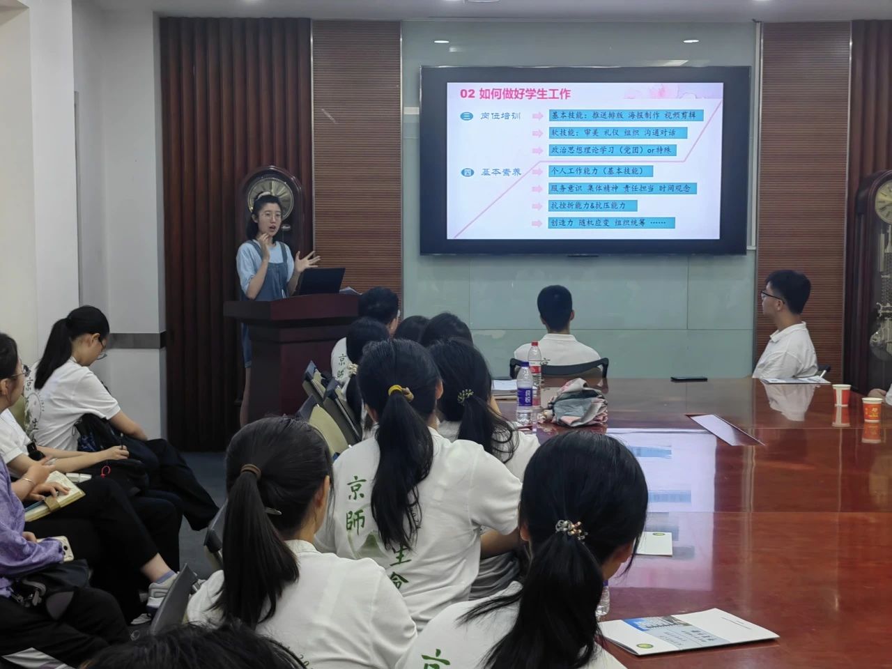 接着是2021级生物科学专业本科生谢言师姐,为大家带来了学生工作经验分享。师姐首先带领大家科学全面认识学生工作,结合自己亲身经历和他人事迹讲述如何做好学生工作,最后也强调了如何平衡好学业与学工的关系,让大家面对大学学生工作不再迷茫。
