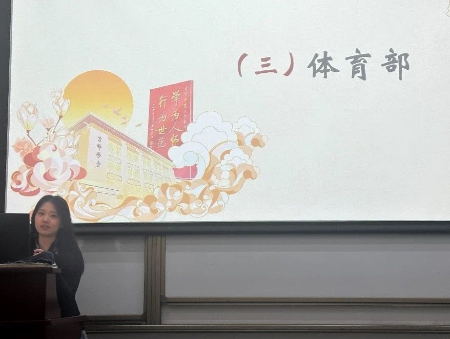 体育部部长陈怡首先总结了体育部本学期的工作:各运动队与体育部对接活动、新生运动会以及各种体育赛事的开展,并且将各个活动的策划案保存到了网盘中,其次分别介绍了生科院研究生男足、棒垒球队、女篮、羽毛球队在校级比赛的优异成绩,最后陈怡部长鼓励部员继续努力,继续保持,携手努力,创造辉煌,更好地准备下学期的校运会,希望与部员成为生活中的伙伴。