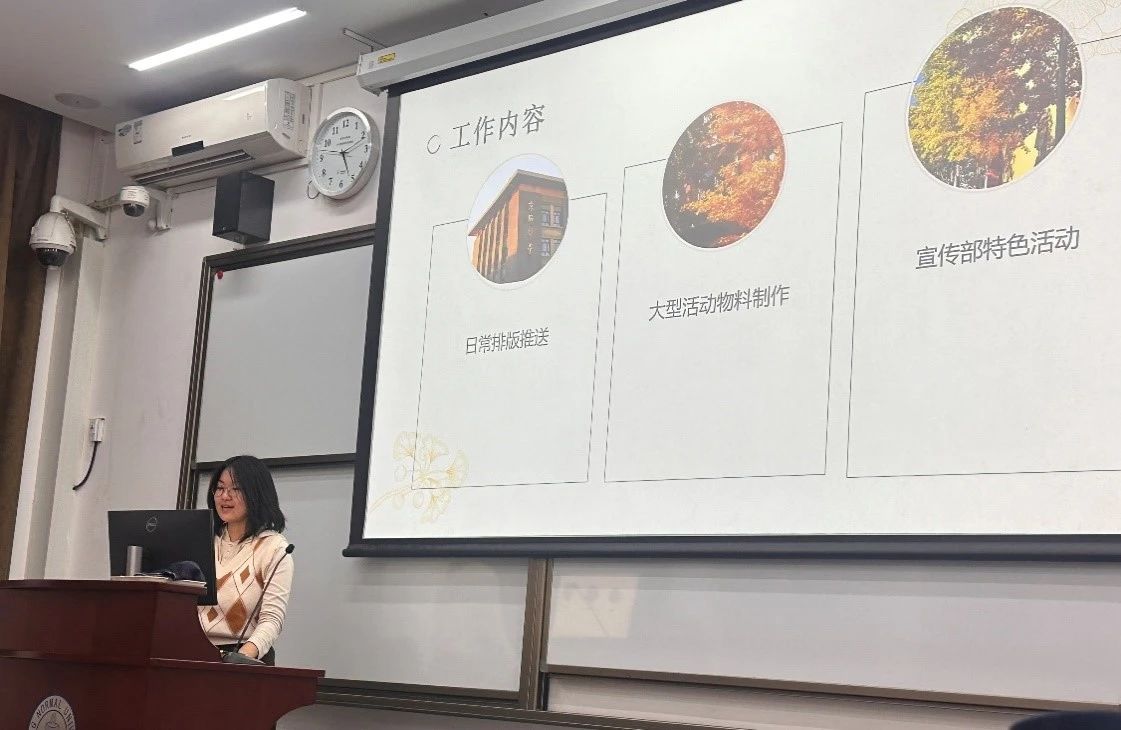 宣传部部长周熠总结了宣传部本学期的工作:学期初的技巧培训、40篇以上的排版、活动摄影与新闻稿撰写、大型活动的物料制作以及宣传部每月的特色活动。周熠部长指出,虽然很多工作都是部员们第一次接触,但是凭借着大家努力工作的态度,经过反复修改,每一项任务都圆满完成,同学们的积极参加也给了宣传部创新的动力。她期待在下学期的工作中可以延续特色活动,迸发更多的灵感与创新,与其他各部门完成更好的配合。