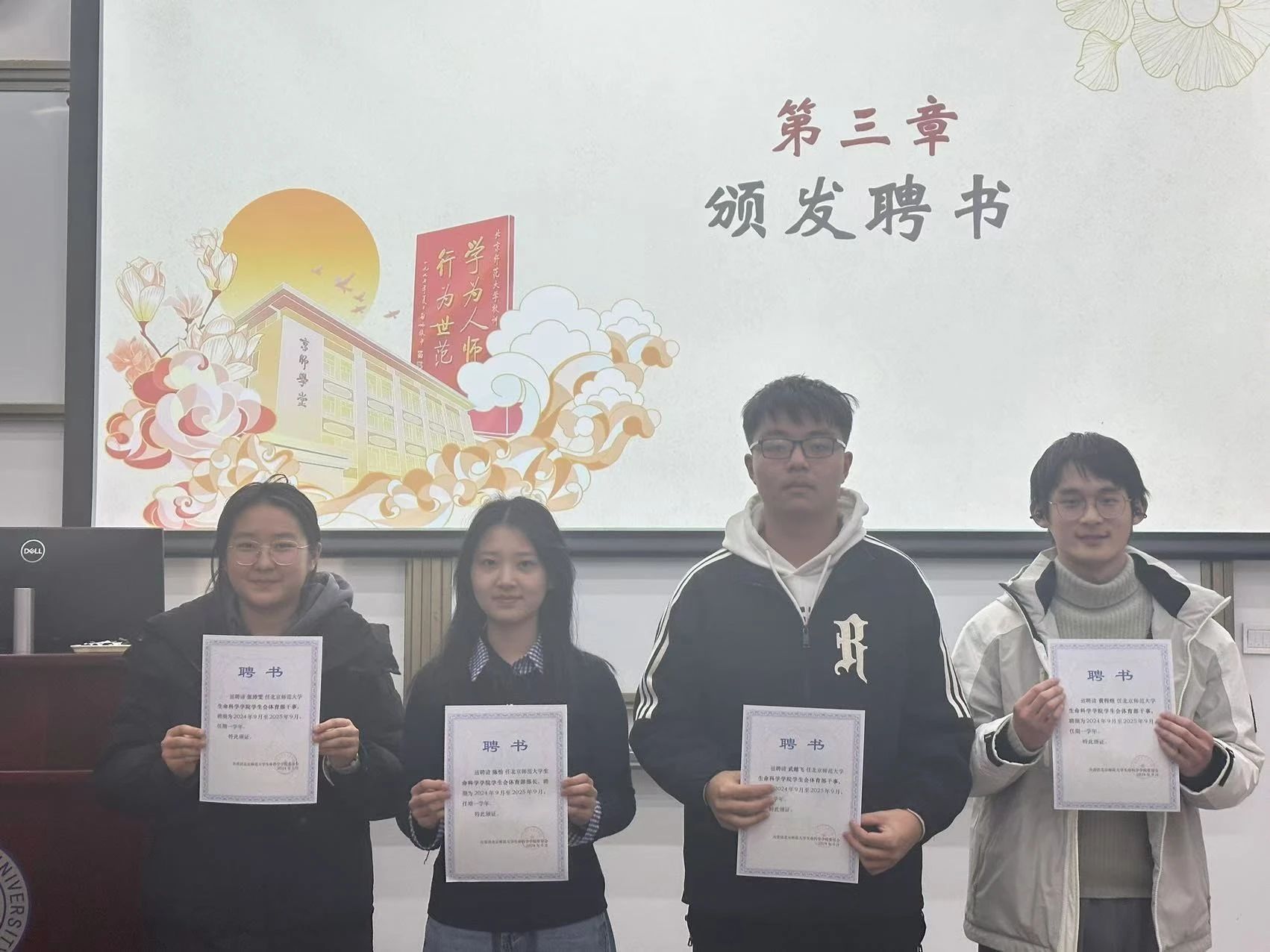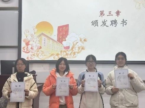 在会议的第三部分,主席及部长为大家颁发了聘书。各部门依次上台领取了聘书,部长和部员合影留念。最后,全体与会人进行了合影留念。