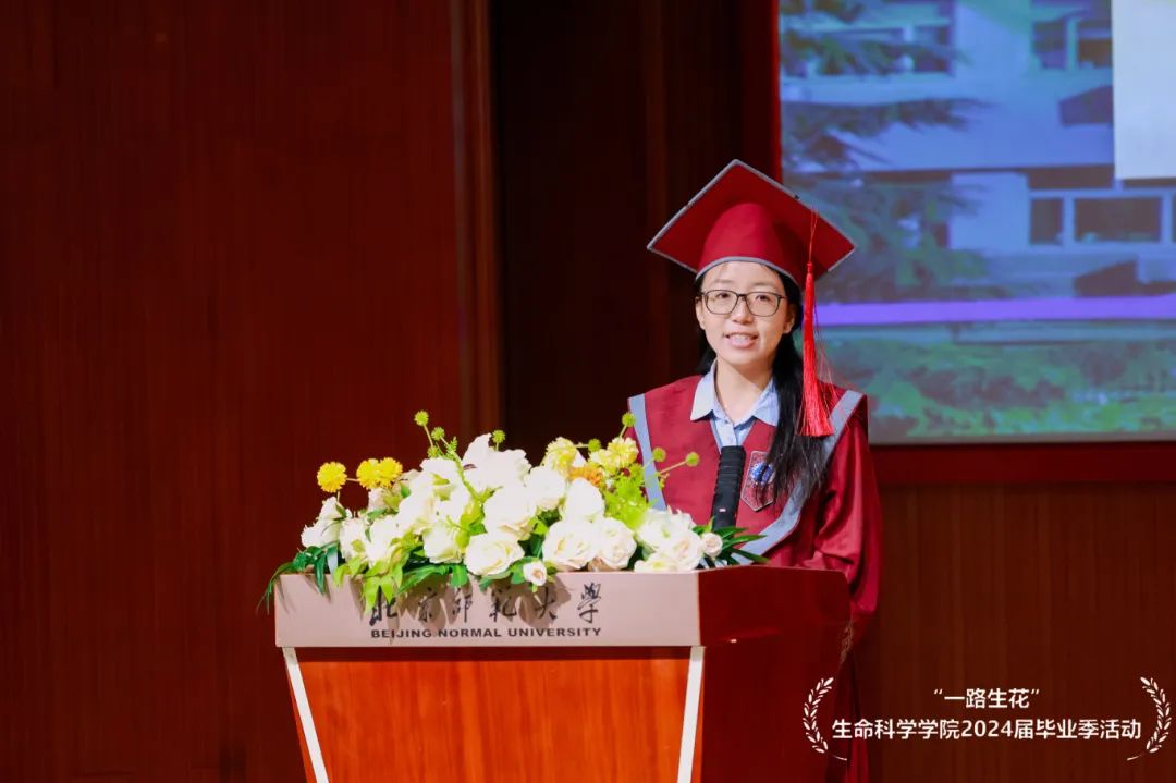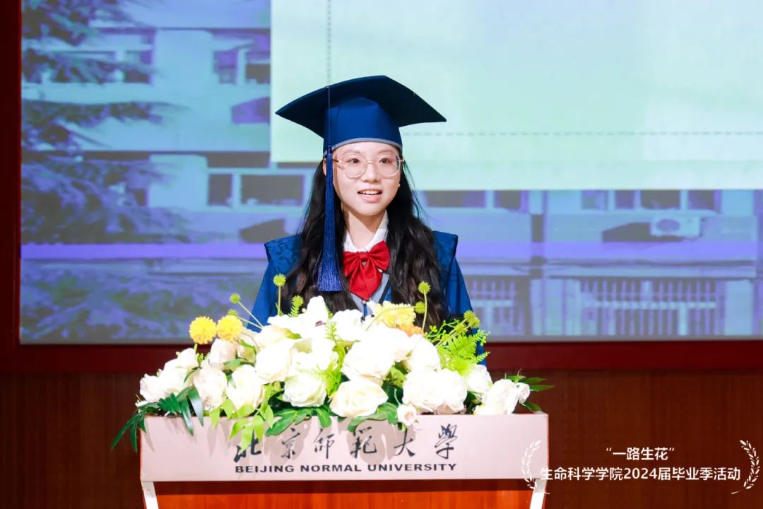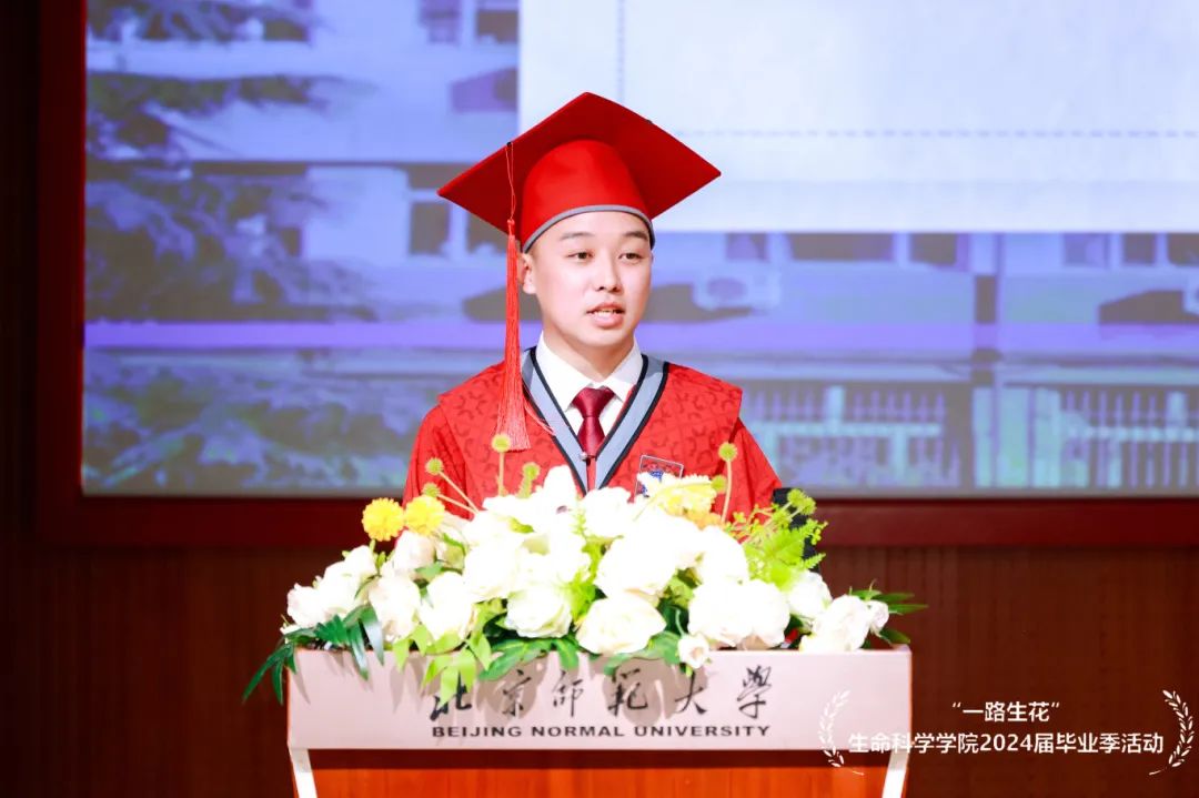 马睿同学作为本科生毕业生代表发言。马睿同学回首了自己在师大度过的四年时光,细数自己实验、本基、野外实习的点点滴滴。马睿同学表示,敬业、乐群、勇毅是北师大赋予我们的宝贵财富。北师大自由博爱的氛围、好学乐群的风气、悠久传承的历史、厚重典雅的沉淀,在我们身上深深烙下印记。