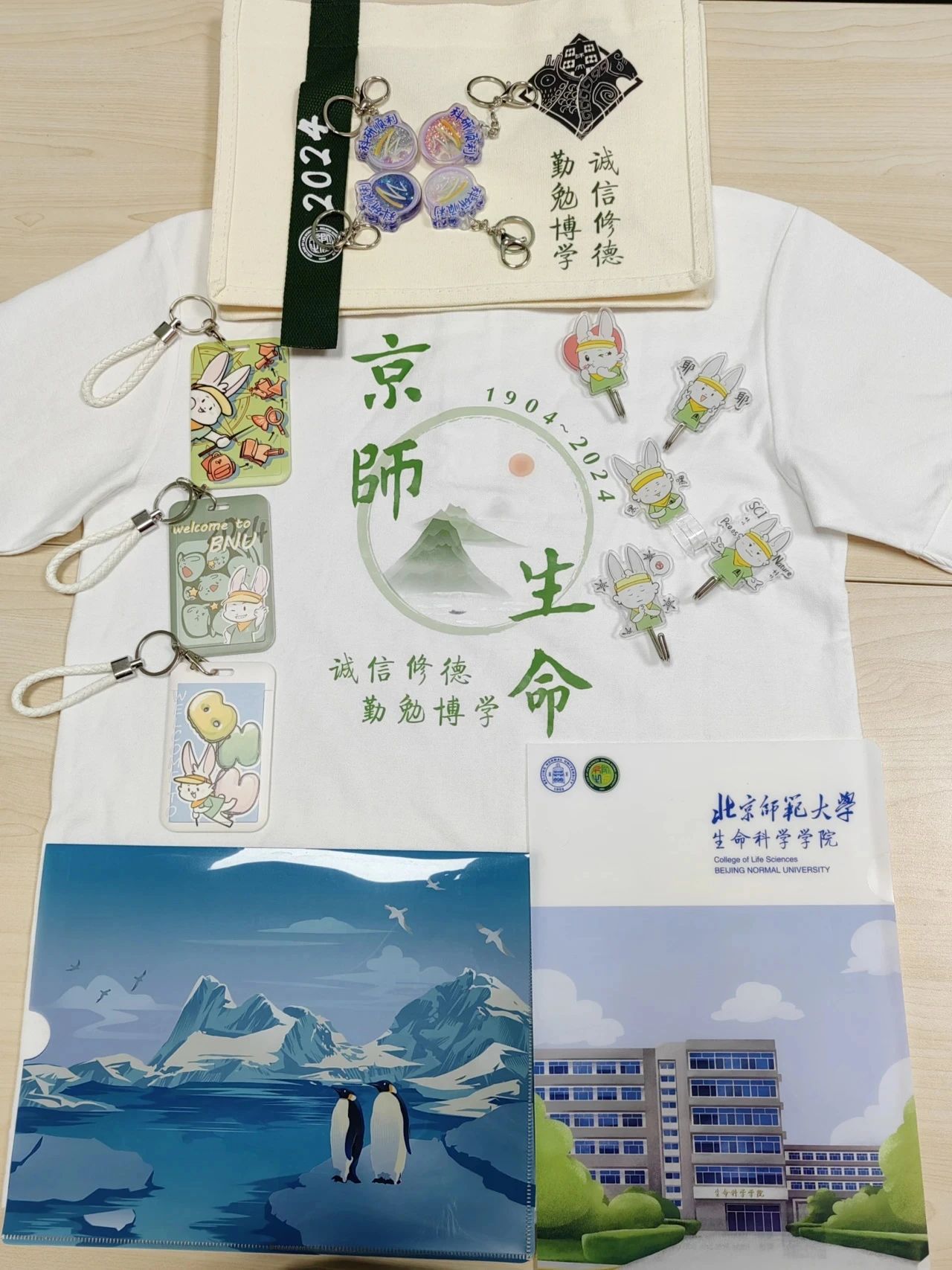 除了常规的开学物资,学院为每个新生准备了一份独特的礼物,包括院衫、帆布袋、师小兔卡套、文件夹、师小兔挂钩、流沙培养皿挂件、《物种起源》《瓦尔登湖》《牛虻》等图书,文创均由同学们亲手设计,心意满满,希望你们喜欢。
